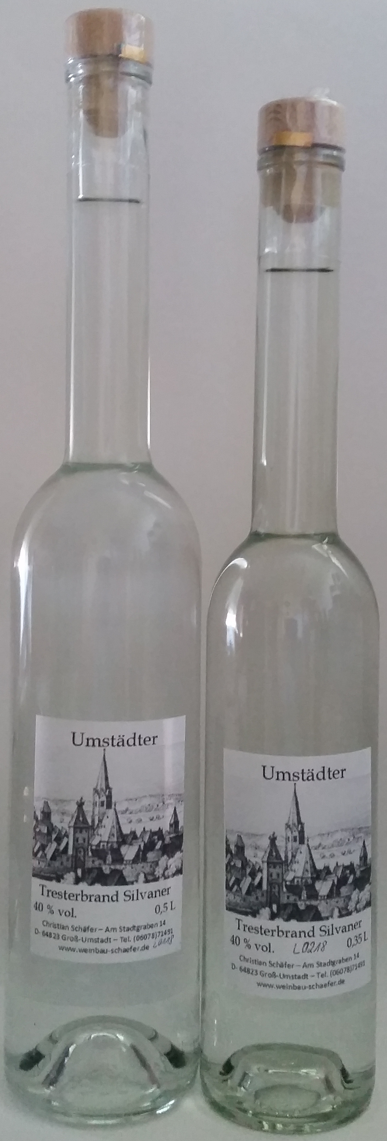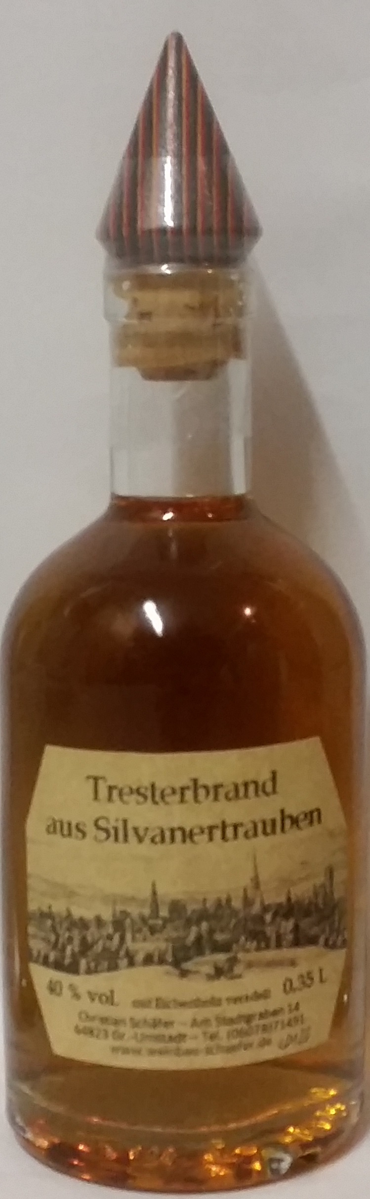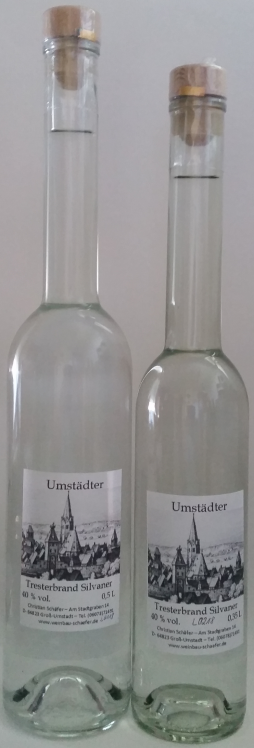 0,5 l Tresterbrand aus Silvanertrauben, Alk. 40%, Preis: 11,50 € (Ltr. 23,00 €)