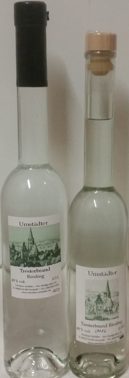 0,5 l Tresterbrand aus Rieslingtrauben, Alk. 40%, Preis: 11,50 € (Ltr. 23,00 €)