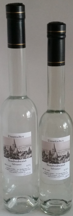 0,5 l Traubenbrand aus Silvanertrauben, Alk. 40%, Preis: 14,50 € (Ltr. 29,00 €)
